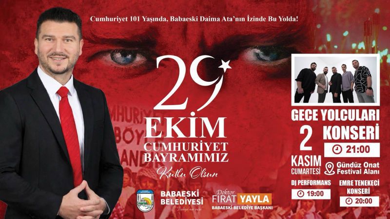 Cumhuriyetimizin 101. yılını coşkuyla kutlamak için Babaeski Belediye Başkanlığı olarak düzenlediğimiz 29 Ekim Cumhuriyet Bayramı etkinlikleri kapsamında, 02.11.2024 tarinde Dj Performansı, Emre Tenekeci ve Gece Yolcuları konserleriyle siz değerli hemşehrilerimizle buluşuyoruz!